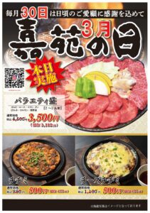 本日30日は毎月恒例の嘉苑の日です。 公開日:2026年3月30日 日頃のご愛顧誠にありがとうございます。 本日30日は毎月恒例の嘉苑の日です。 今月もお得なメニューをご用意しました! 〇バラエティ盛り 通常4,500円 ⇒ 3,500円 〇チヂミ 通常 880円 ⇒ 500円 〇チーズチヂミ 通常 1,100円 ⇒ 500円 本日もお客様のご来店を心よりお待ちしております。